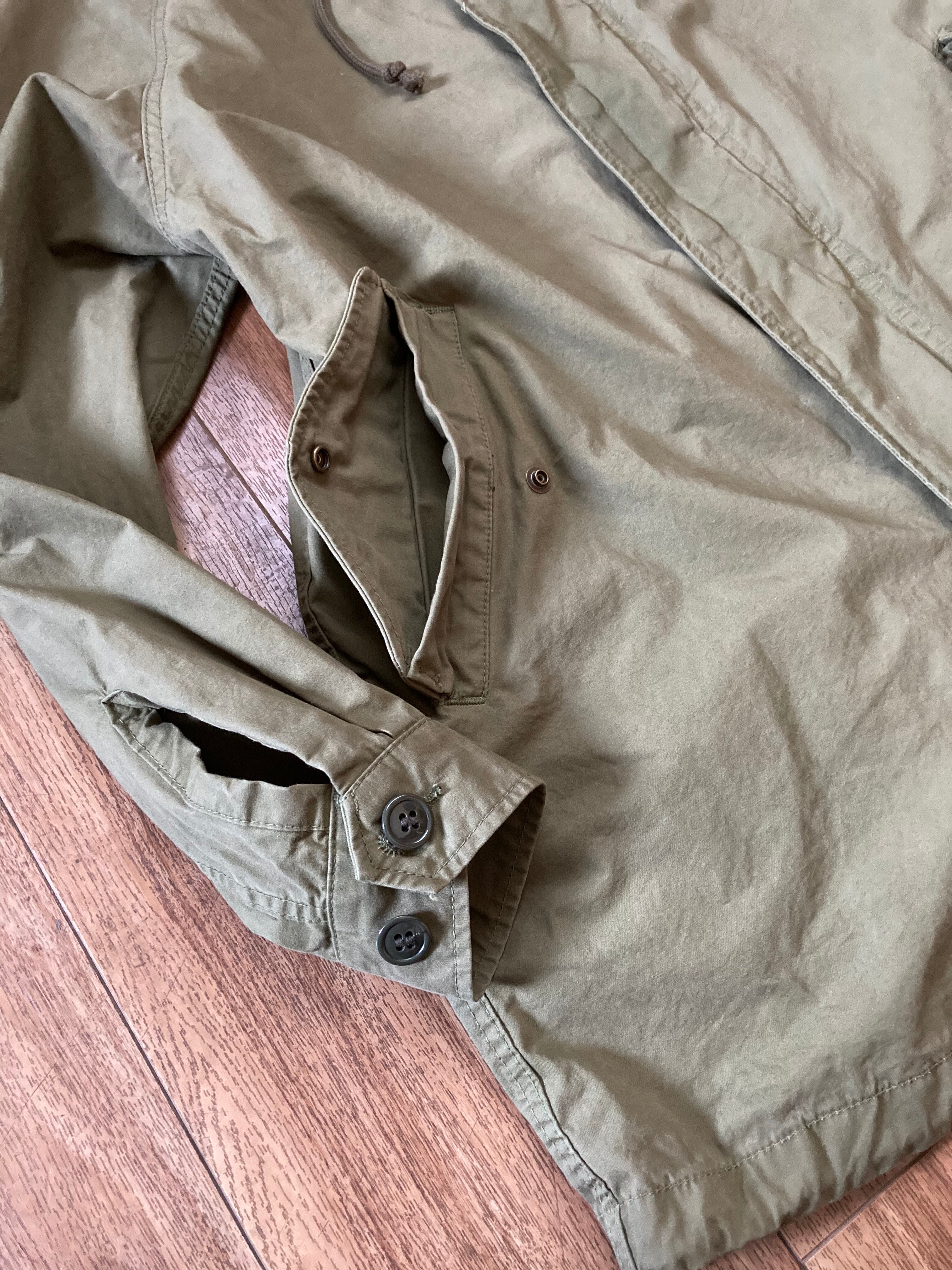 起毛、樹脂加工を施した高密度ウェーザー素材を使用したスタンド フード ショートモッコートになります。生地の風合いがオゾン加工によって、醸し出されるこなれた表情と抜け感が特徴です。ルーズなシルエットで、フラップつきの大きなハンドポケット、フード口と裾にドローコードが付いております。