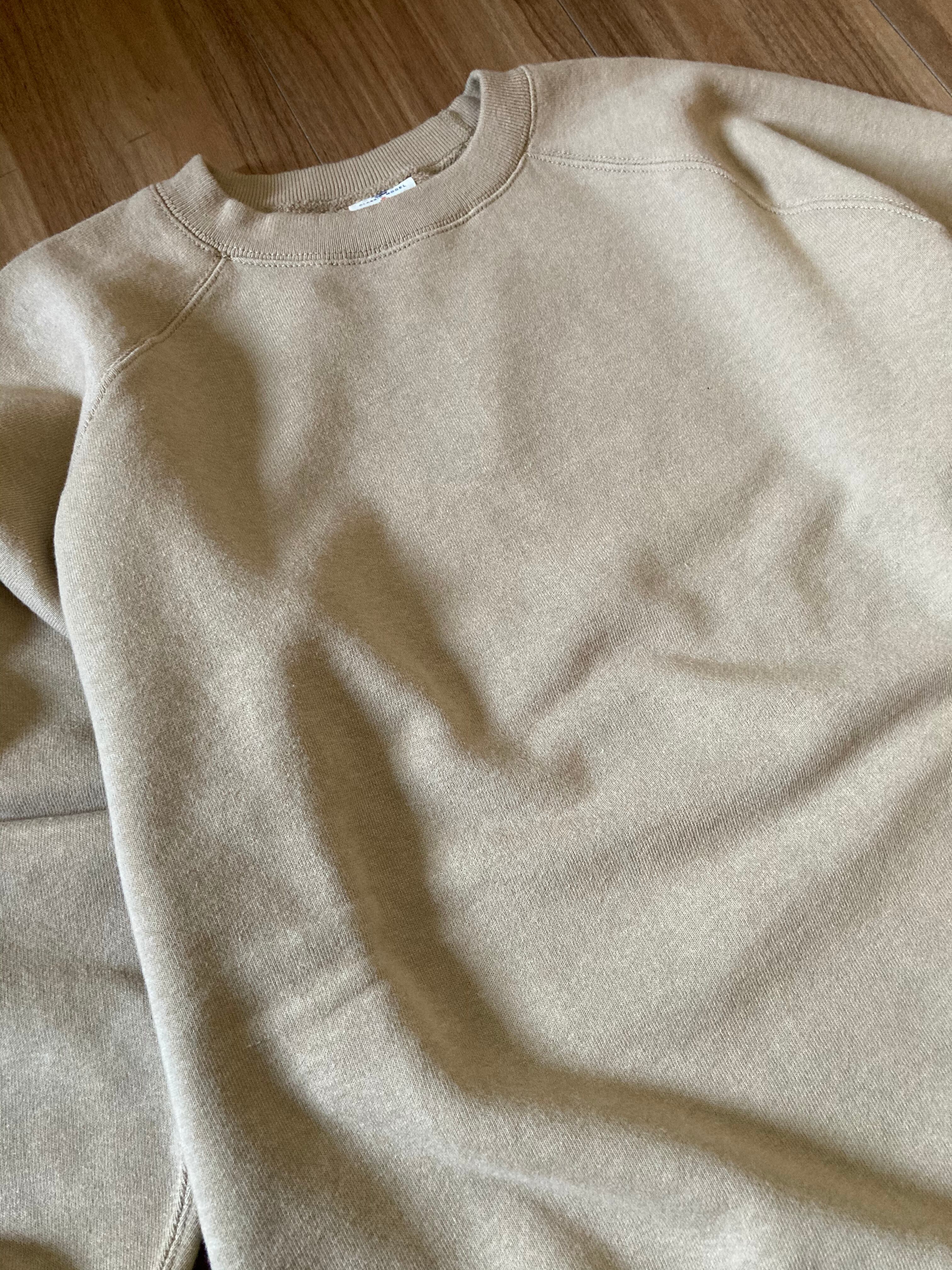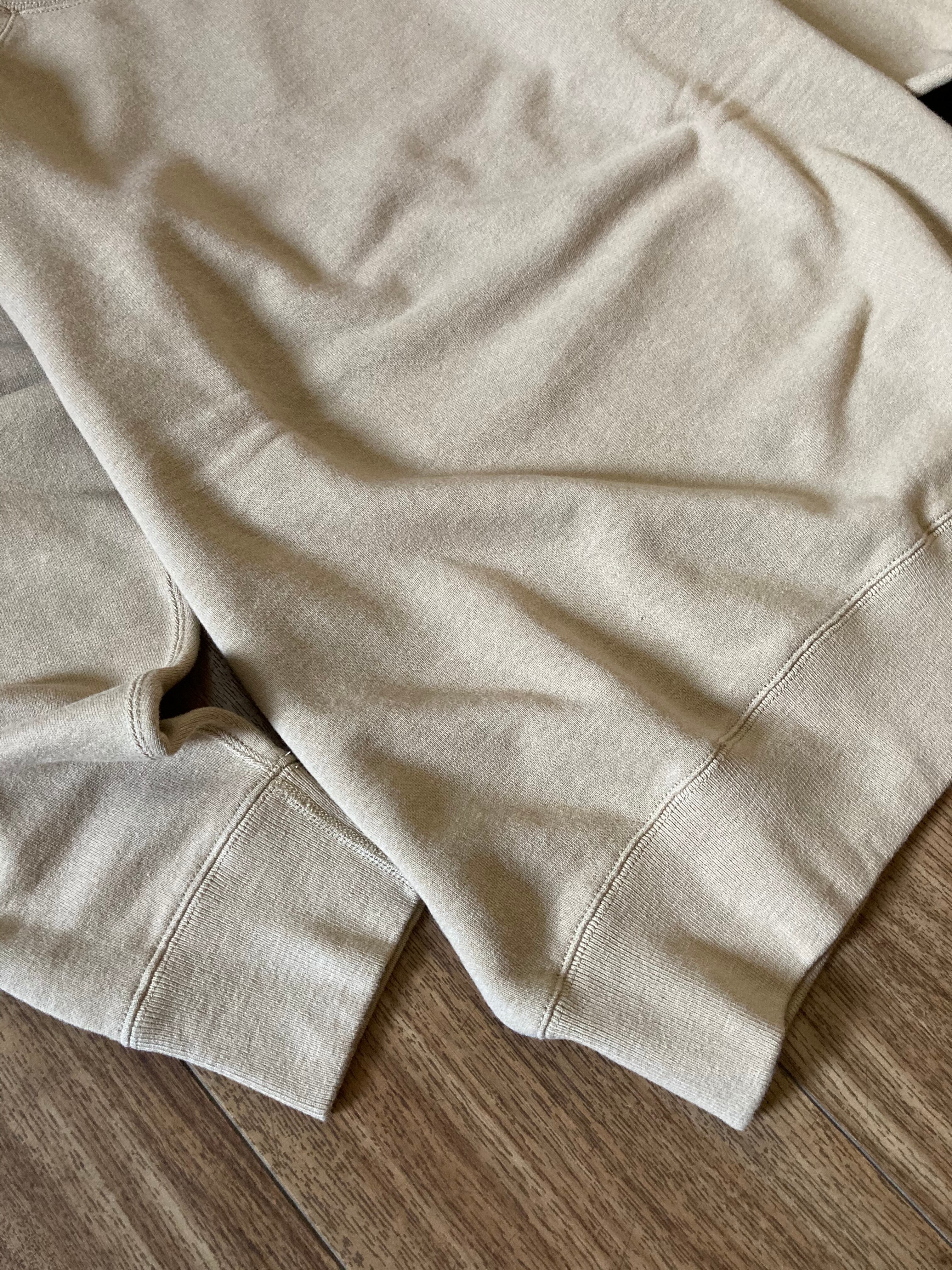 丸胴吊裏毛使用、裏系無起毛のスウェットです。裏がパイル地なので肉厚は少し軽い感じ。縫製は二本針使用、リブはやや短め、両Vとはまた違った、スウェットの王道めいたアイテムです。肩の力の抜けた、上質なスタンダードをお楽しみいただけます。