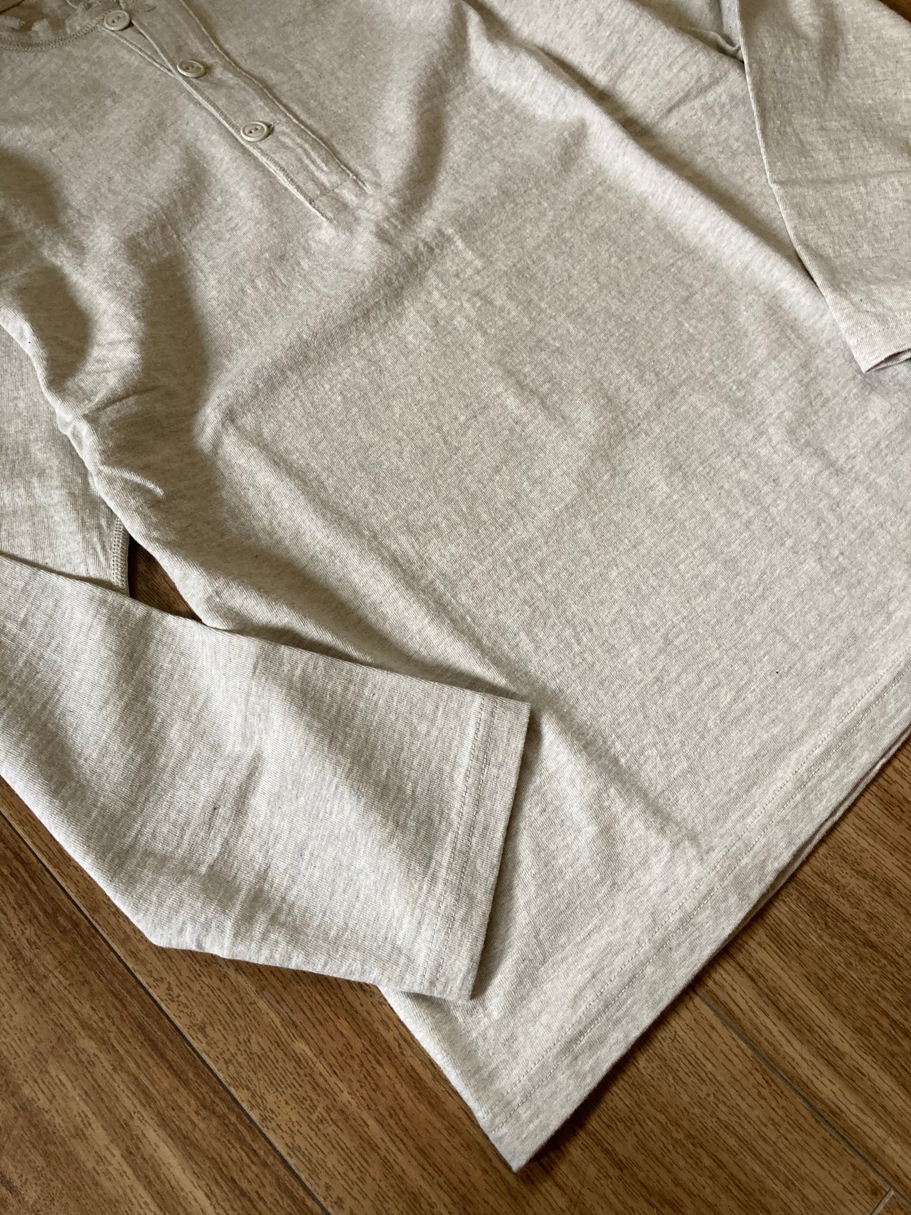 若干立ち上がりのあるスタンドカラーのような雰囲気。前立てを深めにした3ボタンのヘンリーネック。通常の袖丈よりちょっと短く仕上げた九分袖。シンプルなデザインです。