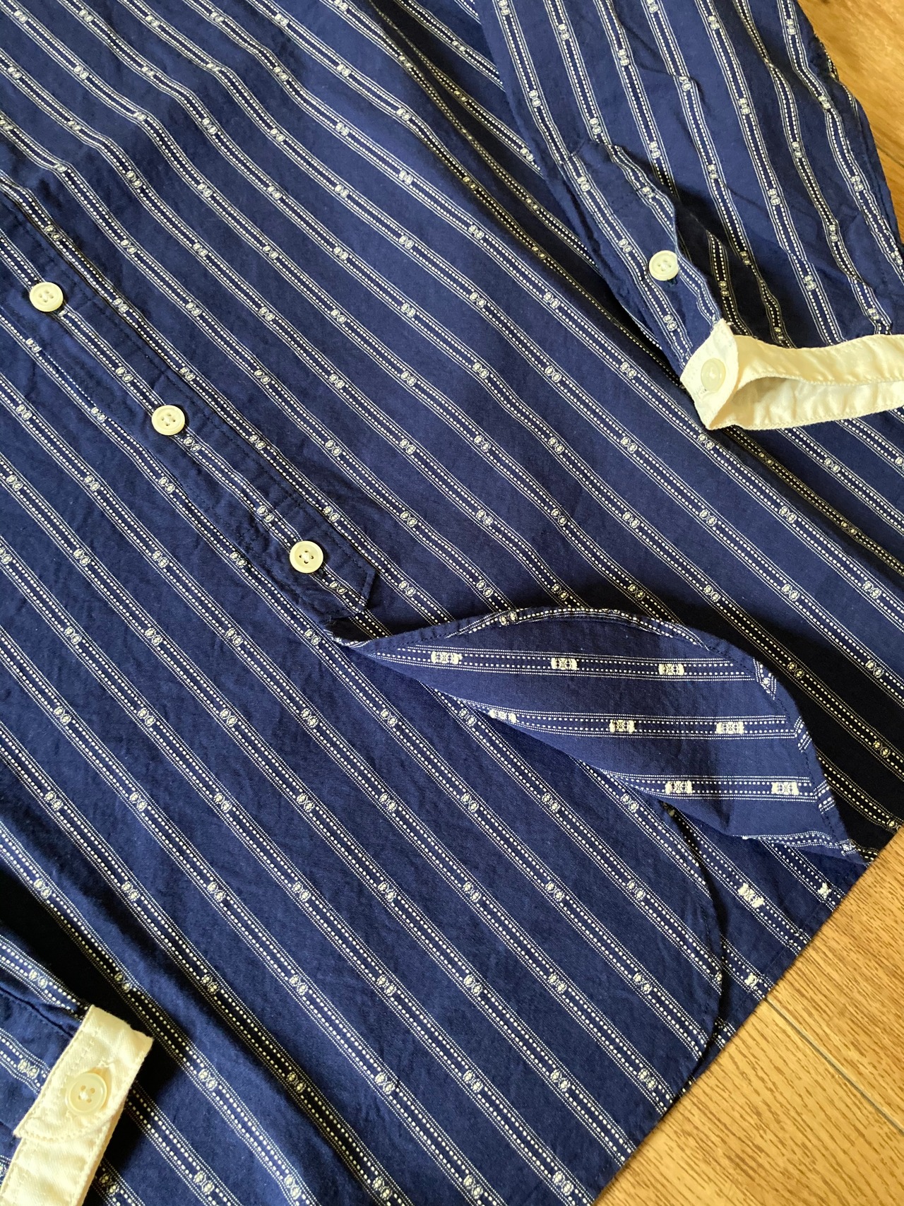 リラックス感のある上品なバンドカラーシャツです。1900年代初頭の生地スワッチをベースに作られたドビーストライプ、を使用したフェイクプルオーバー型で、カラーとカフスの切り替えがアクセントとなっています。
