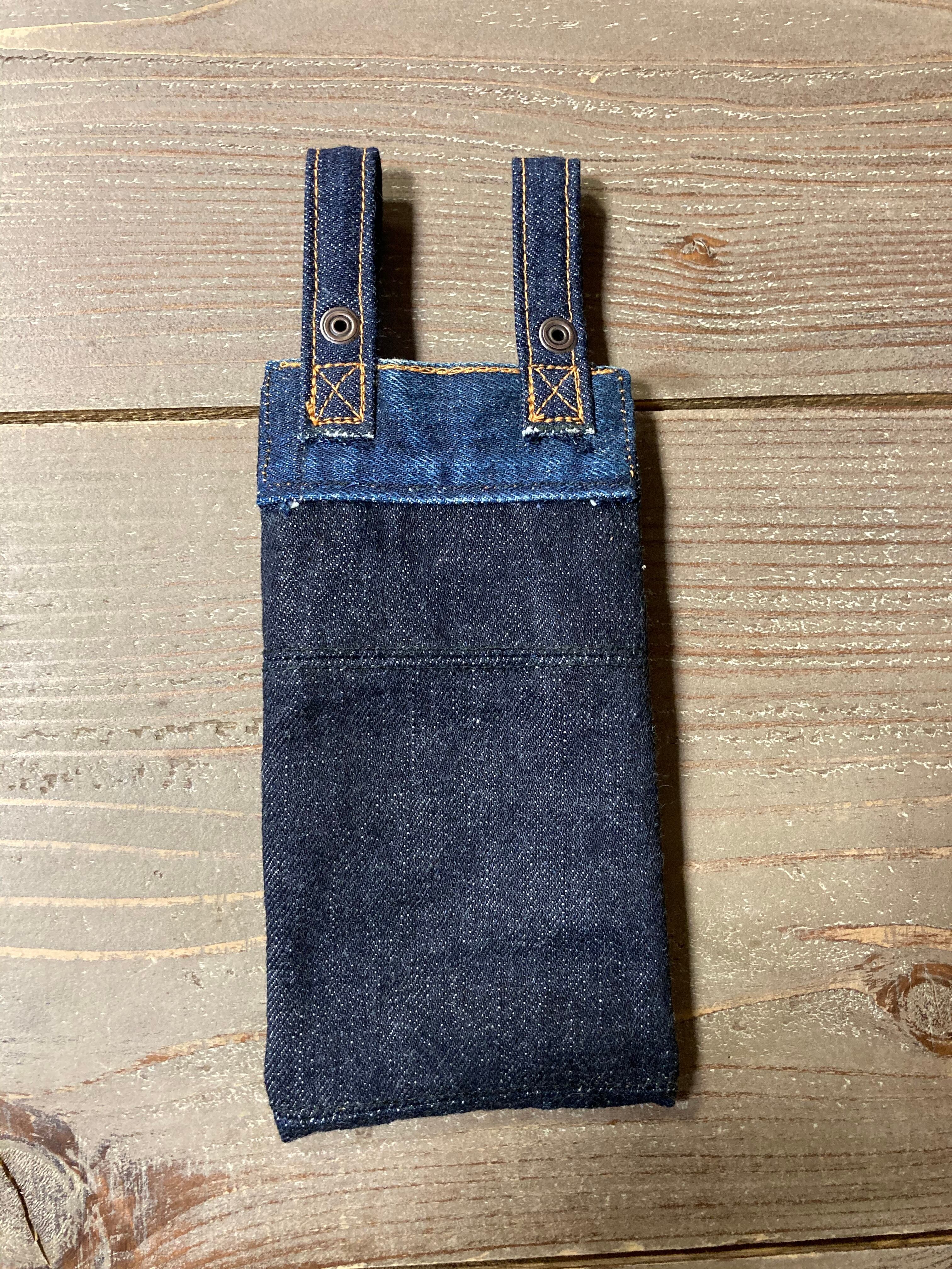 ジーンズの裾とベルトループを利用した、ハンドメイドのスマホケースです。使うほどにアジが出きて経年変化が楽しみ。