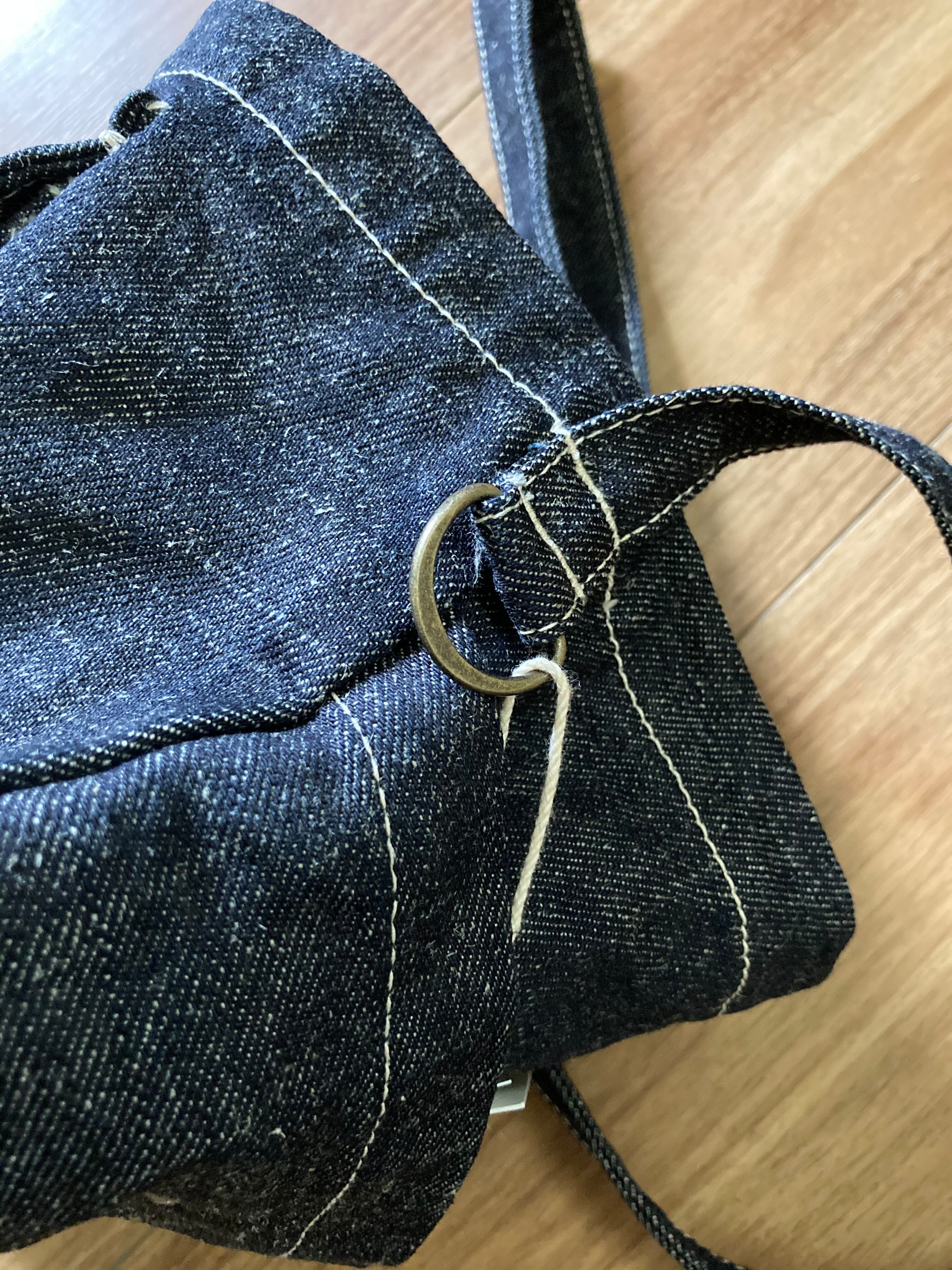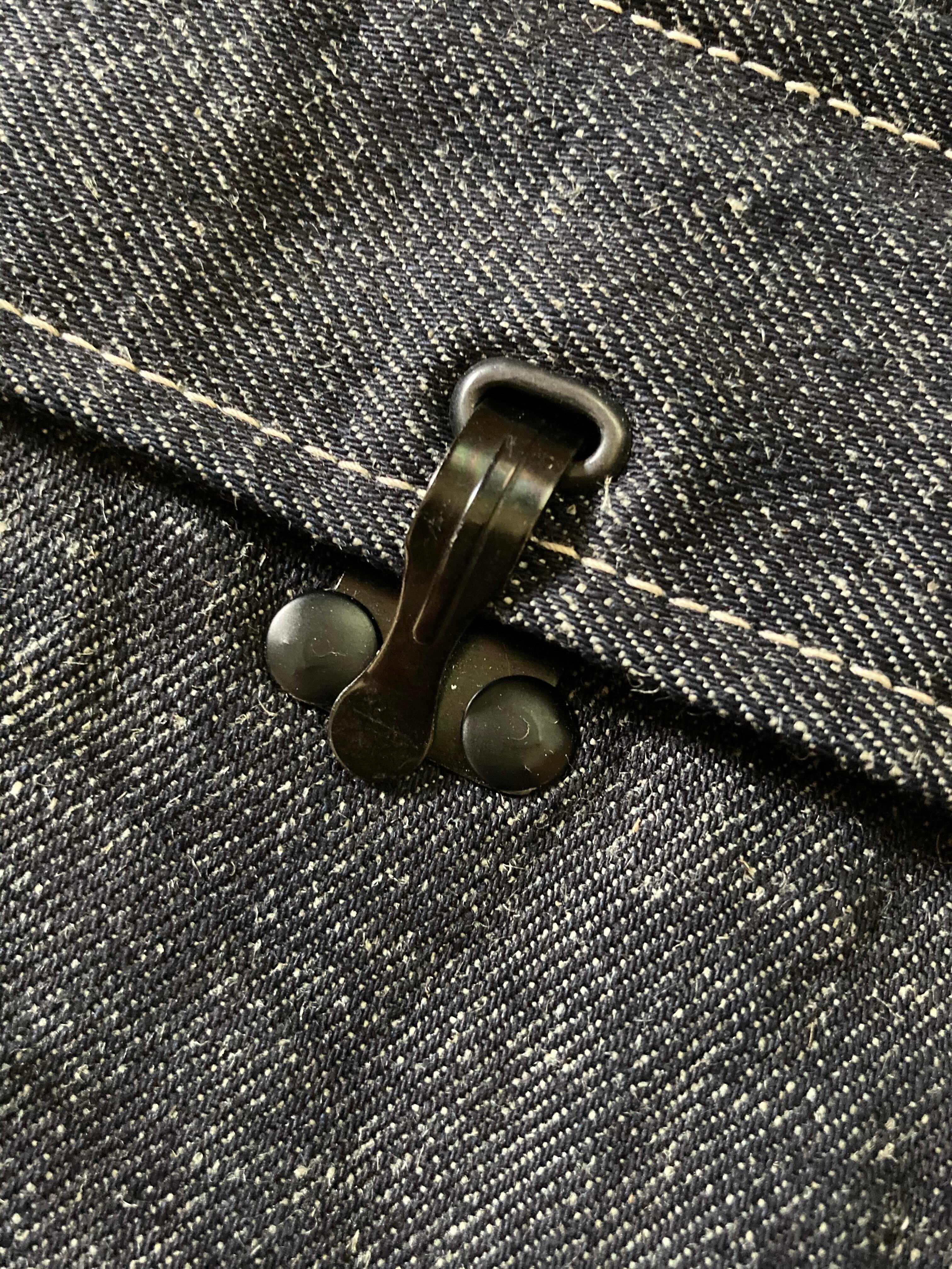 収納力を考え、全面にミリタリーらしいマチ付きのポケット、背面にもポケットを設けた。左側のDカンには、鍵やフックを引っ掛けることが出来る。マチ付きのポケットには、ミリタリーフックを打ちつけ、無骨な雰囲気をプラスした。