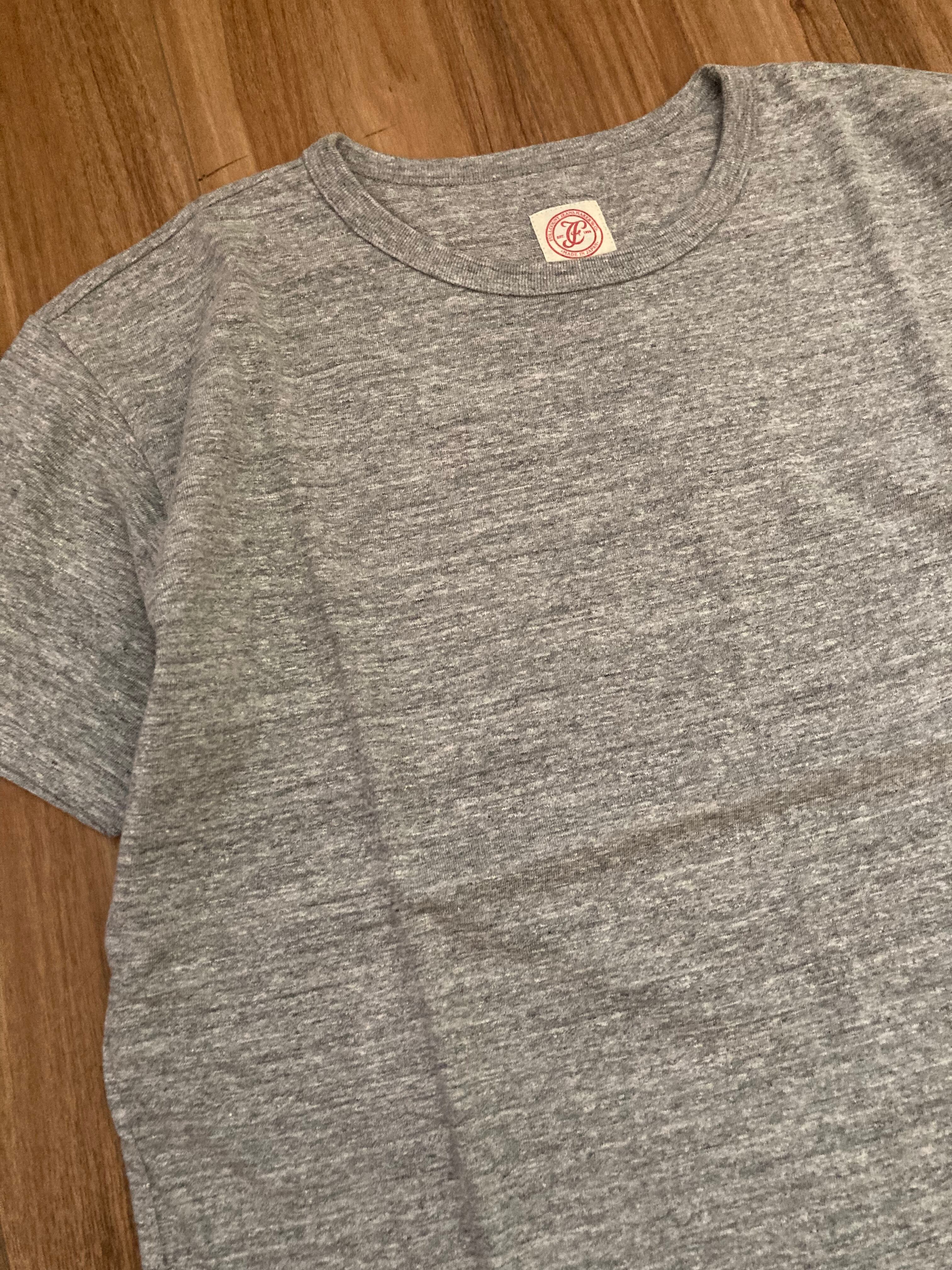 杢グレーのシンプルイズベストなTシャツ。アメリカの昔の規格に沿った糸19/1粗挽きTOP杢の糸を、小寸の編み機でサイズごとに編み上げ、フルカウントが思う理想のヴィンテージアメリカンシルエットのTシャツを作りました。