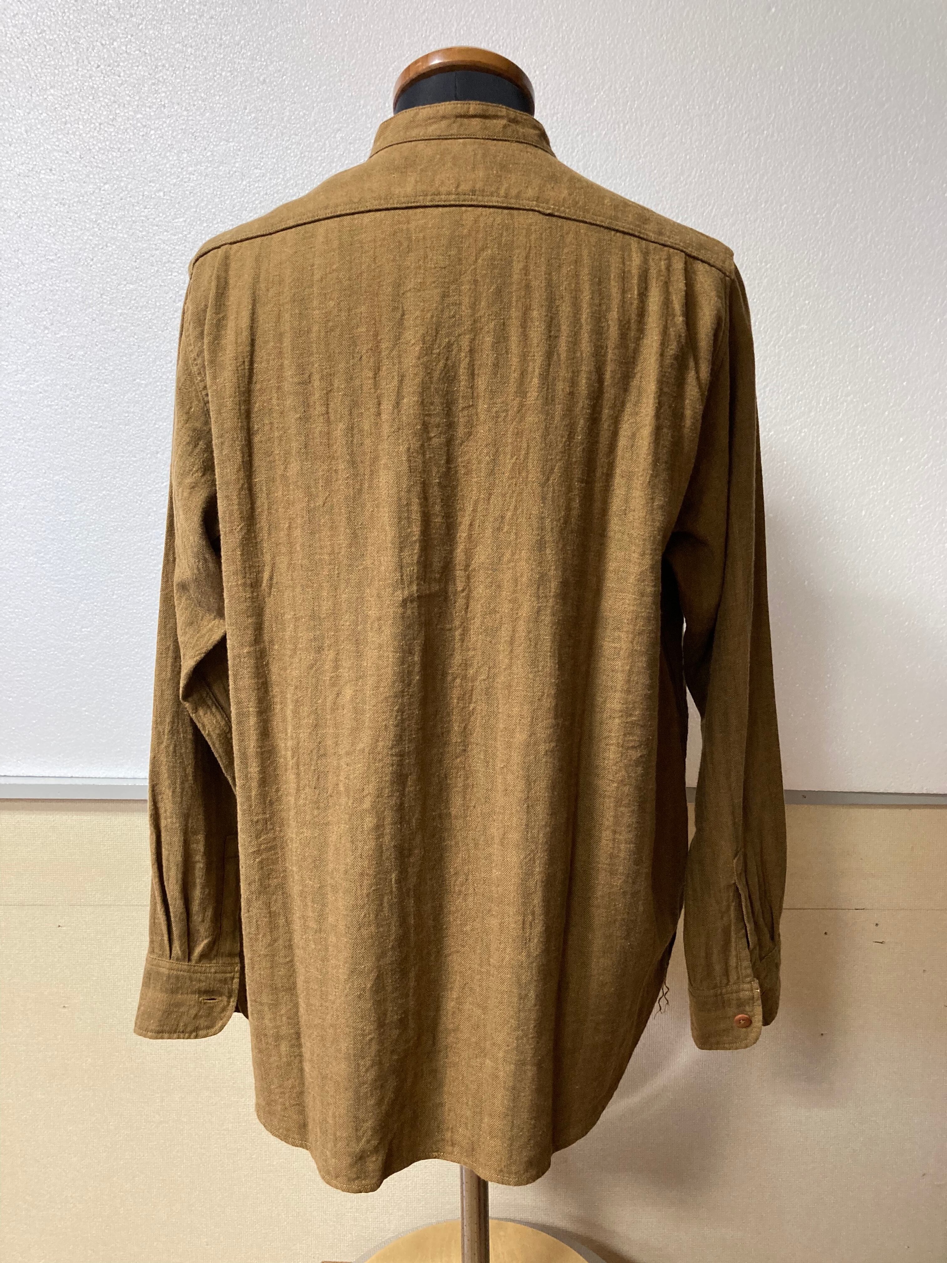 イギリス軍のバンドカラーシャツをデザインソースに作成されたシャツ。生地は糸の色を絶妙に変化させヘリンボーン織にすることで、ナチュラルなストライプ柄を表現しています。